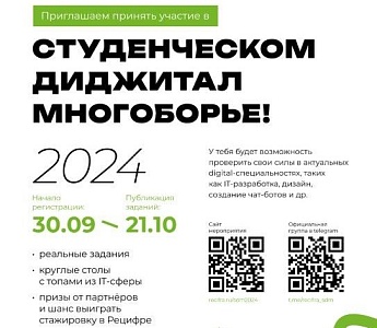 С 21 октября 2024г. по 11 ноября 2024г. для студентов ВУЗов и СУЗов (как очной, так и заочной формы обучения) Югры пройдет Ⅱ Студенческое Диджитал Многоборье (далее - Многоборье).