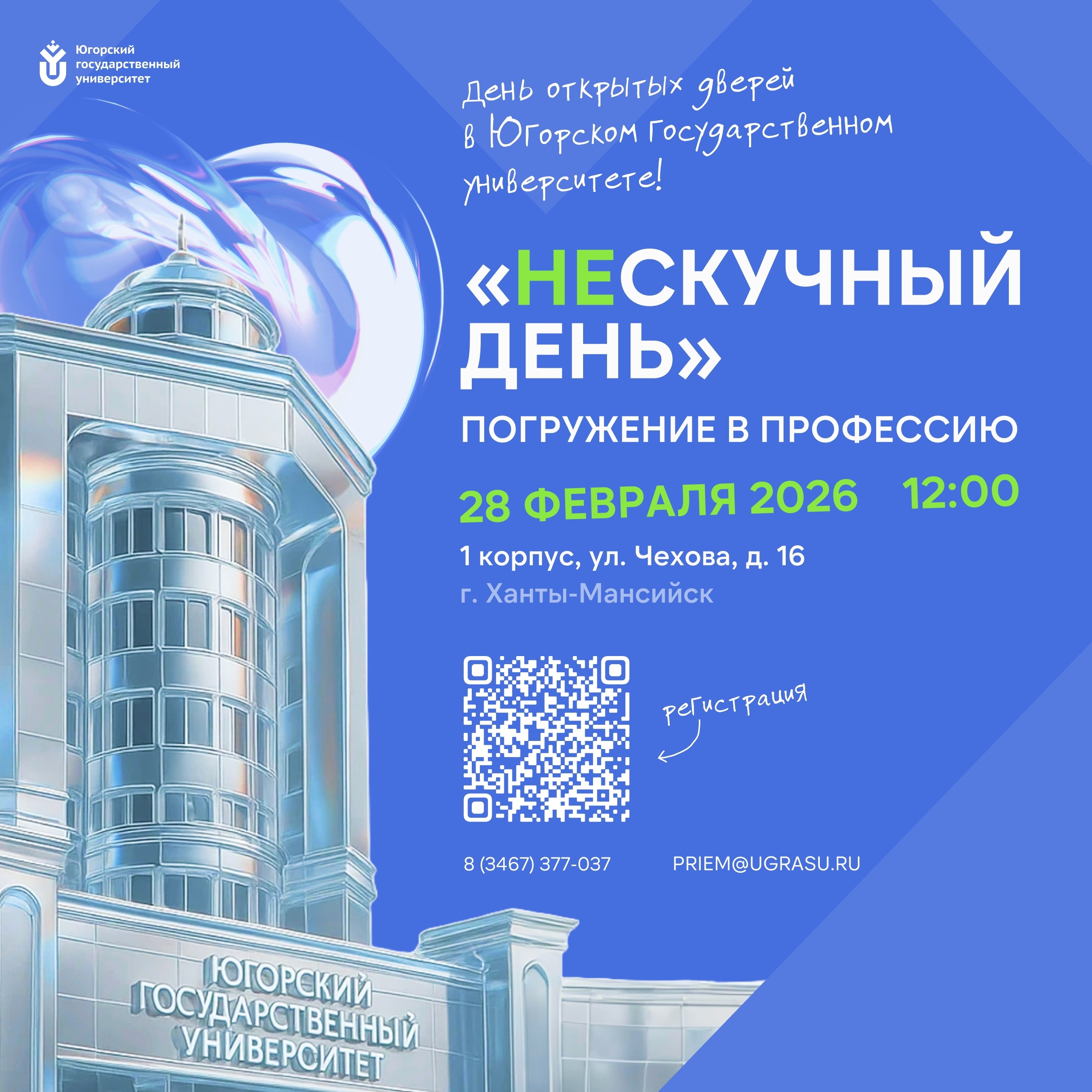 Приглашаем вас на День открытых дверей Югорского государственного университета — день, который поможет определиться с будущей профессией и почувствовать себя частью студенческой жизни уже сейчас.