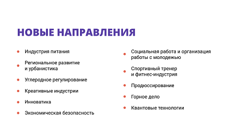 В числе новых направлений – «Индустрия питания», «Региональное развитие и урбанистика», «Углеродное регулирование», «Креативные индустрии», «Инноватика», «Социальная работа и организация работы с молодежью», «Экономическая безопасность», «Спортивный тренер и фитнес-индустрия», «Продюссирование», «Горное дело», «Квантовые технологии».