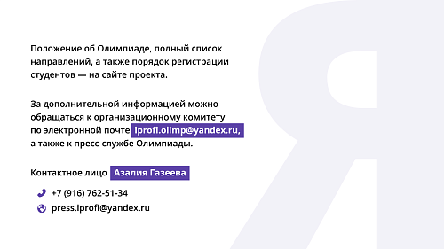За дополнительной информацией можно обращаться к организационному комитету по электронной почте iprofi.olimp@yandex.ru, а также к пресс-службе Олимпиады.