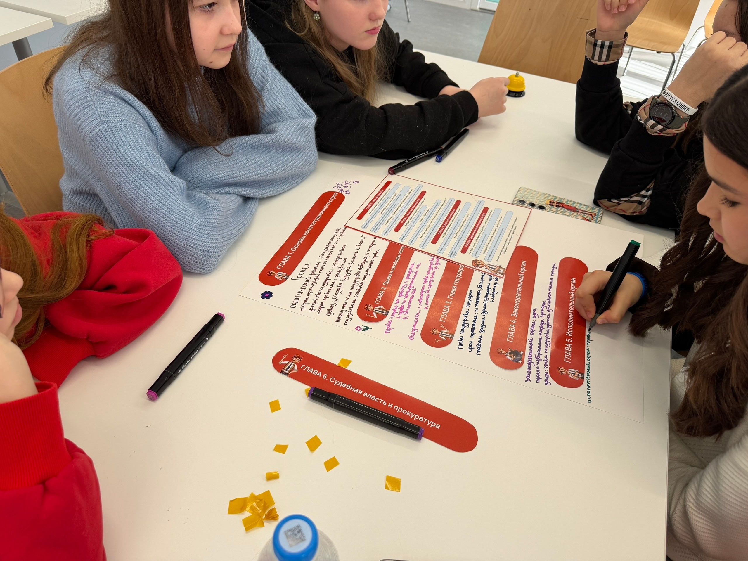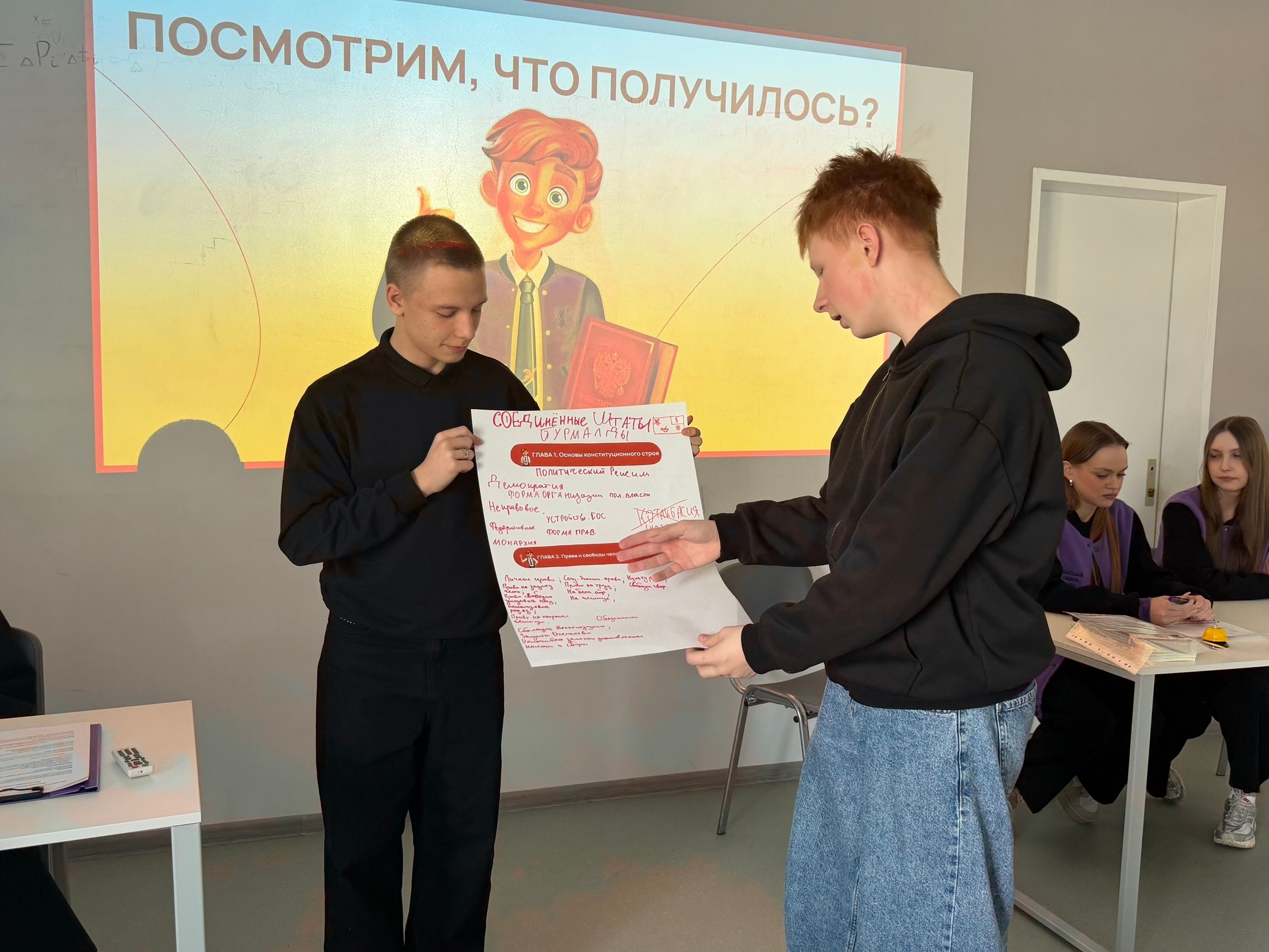 Школьники попробовали себя в роли разработчиков и создали собственный проект основного закона страны. В блиц-опросе кадеты проявили настоящую смекалку и внимательность, уверенно отвечая на сложные вопросы.