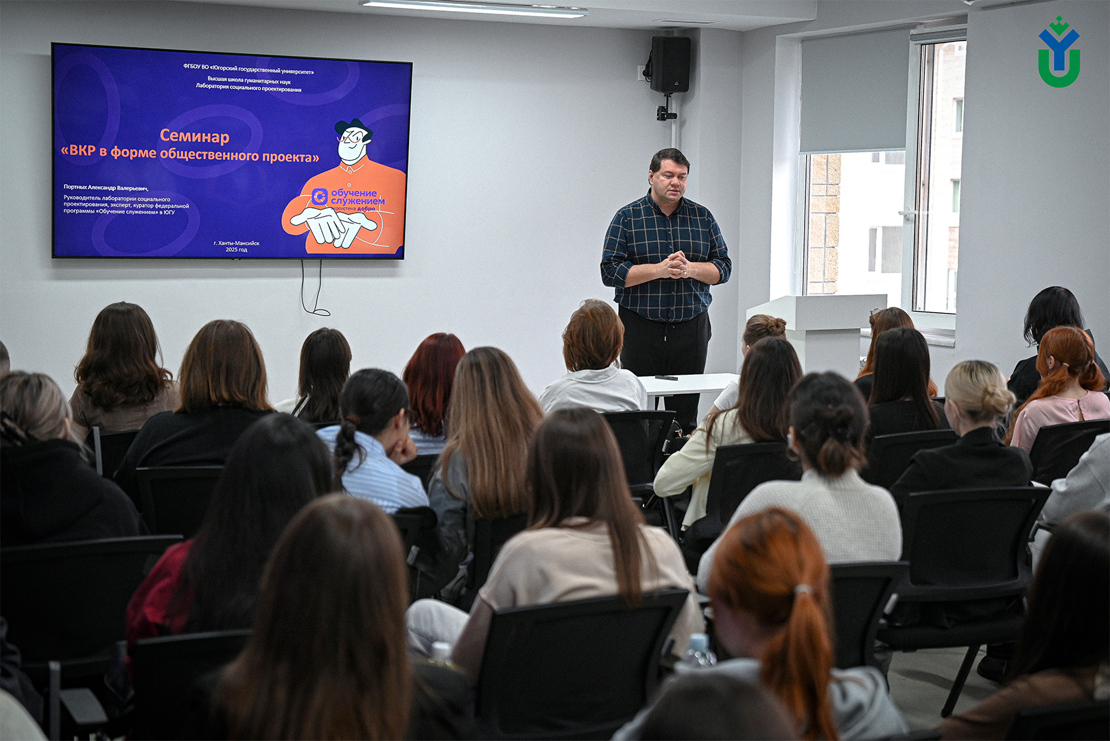 В прошедшем учебном году 10 ВКР в форме общественного проекта выполнили 18 студентов ЮГУ направлений подготовки «Журналистика», «Лингвистика» и «Социальная работа». Заказчиками ВКР выступили 10 социальных партнеров. Добавим, что социальными партнёрами вуза являются Здравоохранение Югры, Центр профпатологии, ОКБ, Музей Природы и Человека, АНО «Малая Родина», Центр активного долголетия, Центр развития детей с задержками развития «РАСсвет», АНО «Культурно-просветительский центр «Гармония». Александр Портных познакомил студентов с конкретными дипломными проектами, среди которых проект «Silver Age English» по обучению иностранному языку людей пожилого возраста (социальным партнёром выступил «Ханты-Мансийский комплексный центр социального обслуживания населения»), специфика медиасопровождения деятельности «Ханты-Мансийской региональной организации Всероссийского общества слепых» в социальной сети ВКонтакте и другими.