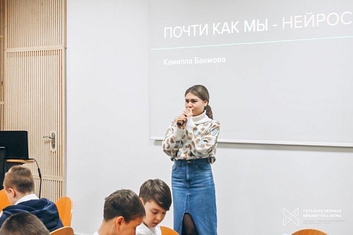 Студентка Инженерной школы цифровых технологий ЮГУ Камилла Баимова провела для учащихся 5-11 классов Ханты-Мансийска мастер-класс по искусственному интеллекту «Почти как мы: нейросети». Провести занятие для школьников Камиллу пригласил Югорский НИИ информационных технологий. Мастер-класс прошёл в Государственной библиотеке Югры и был приурочен 90-летию учреждения.