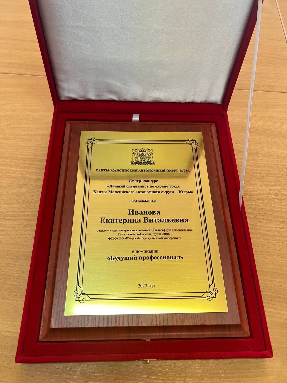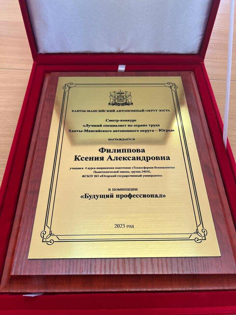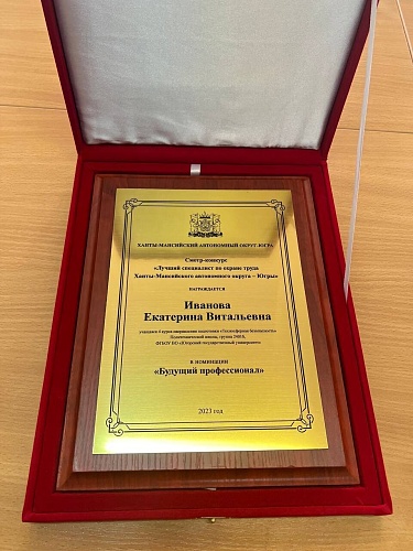 На мероприятии также наградили студентов 4 курса Ксению Филиппову и Екатерину Иванову, которые приняли участие в окружном этапе смотра-конкурса «Лучший специалист по охране труда в Югре». Дипломы в номинации «Будущий профессионал» студентам ЮГУ вручили заместитель директора, начальник управления труда Департамента труда и занятости населения Югры Алексей Мокринский и начальник отдела охраны труда и экспертизы Департамента Игорь Тебеньков.