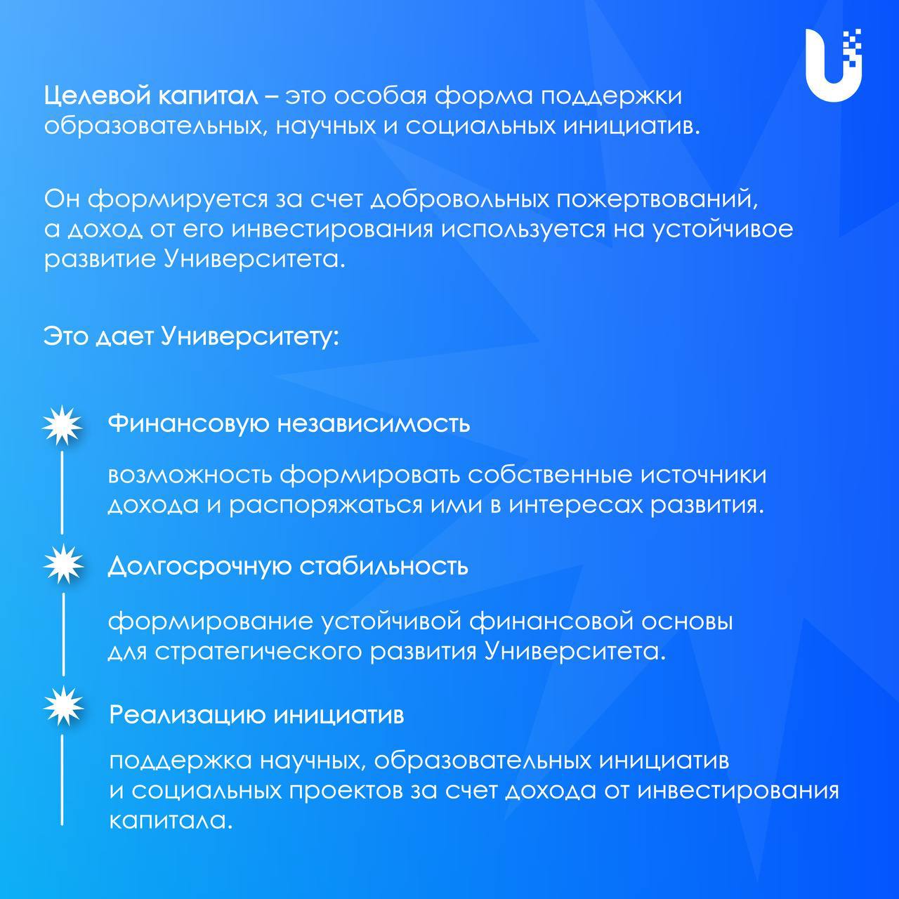 Мы формируем капитал, который сохраняется и приумножается. Не сами средства, а ежегодный доход от них направляется на поддержку тех, кто создает будущее нашего региона: