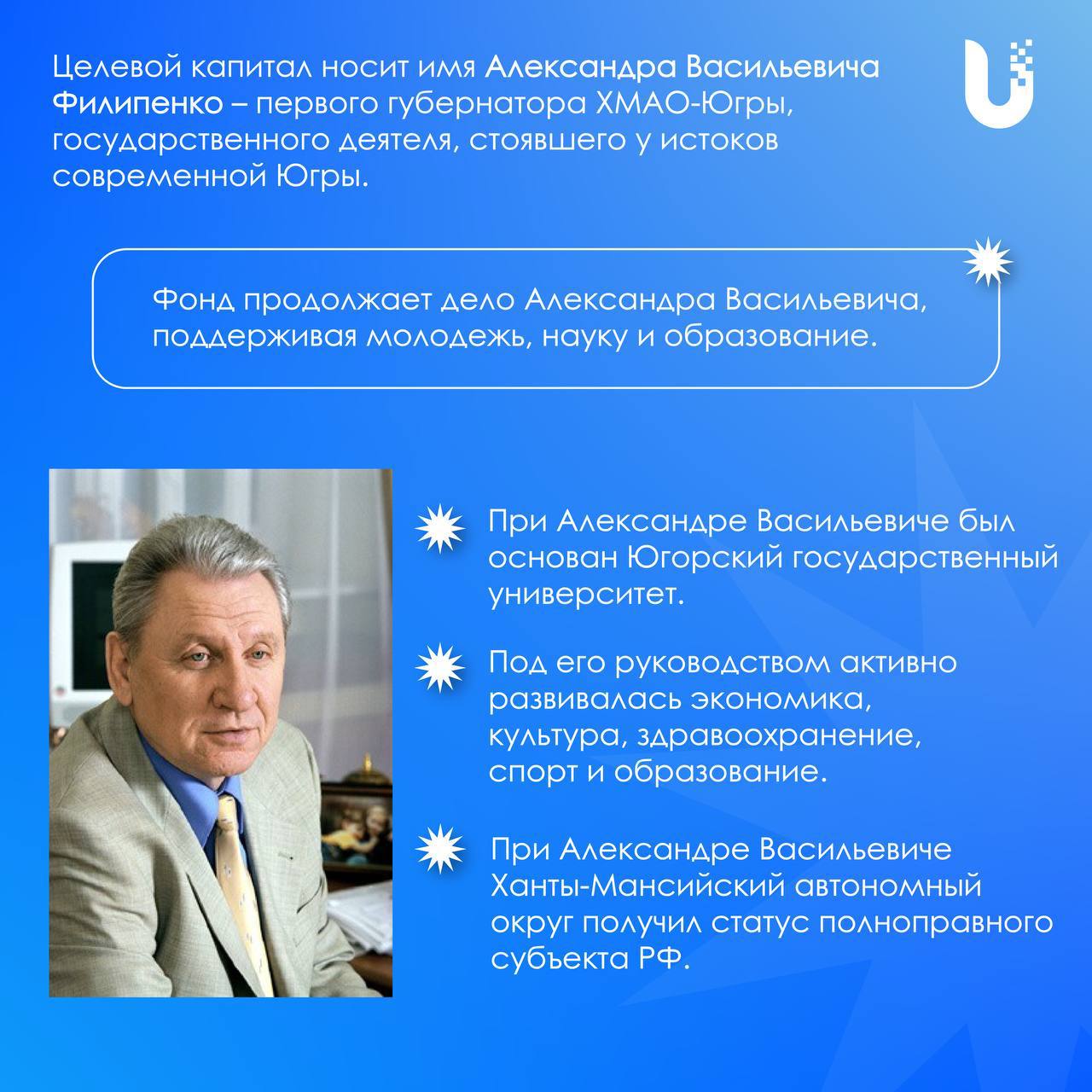 Потому что Александр Васильевич верил в людей и знания. Именно по его инициативе появился ЮГУ — место, где рождаются новые идеи и лидеры Югры. Теперь его дело продолжается через этот капитал.