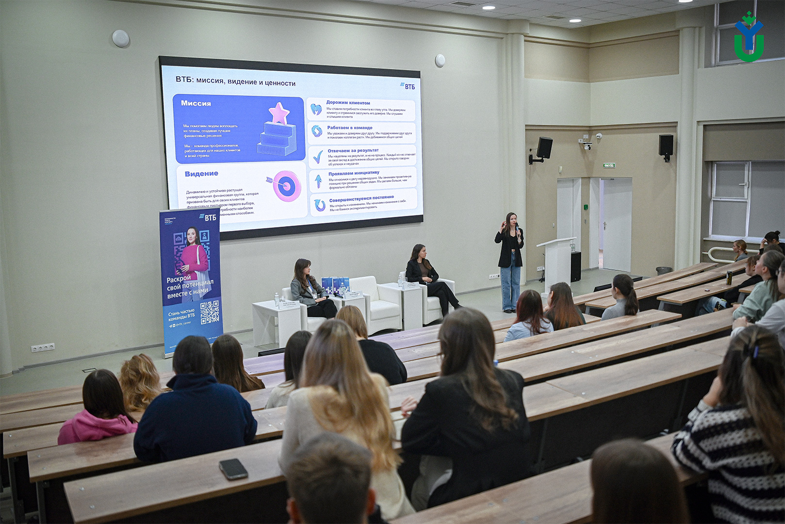 Для студентов 3-5 курсов Высшей школы цифровой экономики ЮГУ карьерный мастер-класс провели представители ПАО ВТБ. Со студентами и своими потенциальными сотрудниками встретились менеджер по развитию бренда работодателя в УрФО Юлия Усова, менеджер по подбору персонала Полина Резникова и главный менеджер группы продаж зарплатных проектов Анастасия Казиахмедова.