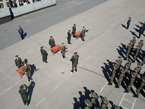 Торжественная церемония началась с выноса Государственного флага Российской Федерации, Боевого знамени и Вымпела Министра обороны. Потом курсанты по очереди читали перед строем взводов текст Военной присяги - произносили слова клятвы на верность Отчизне.