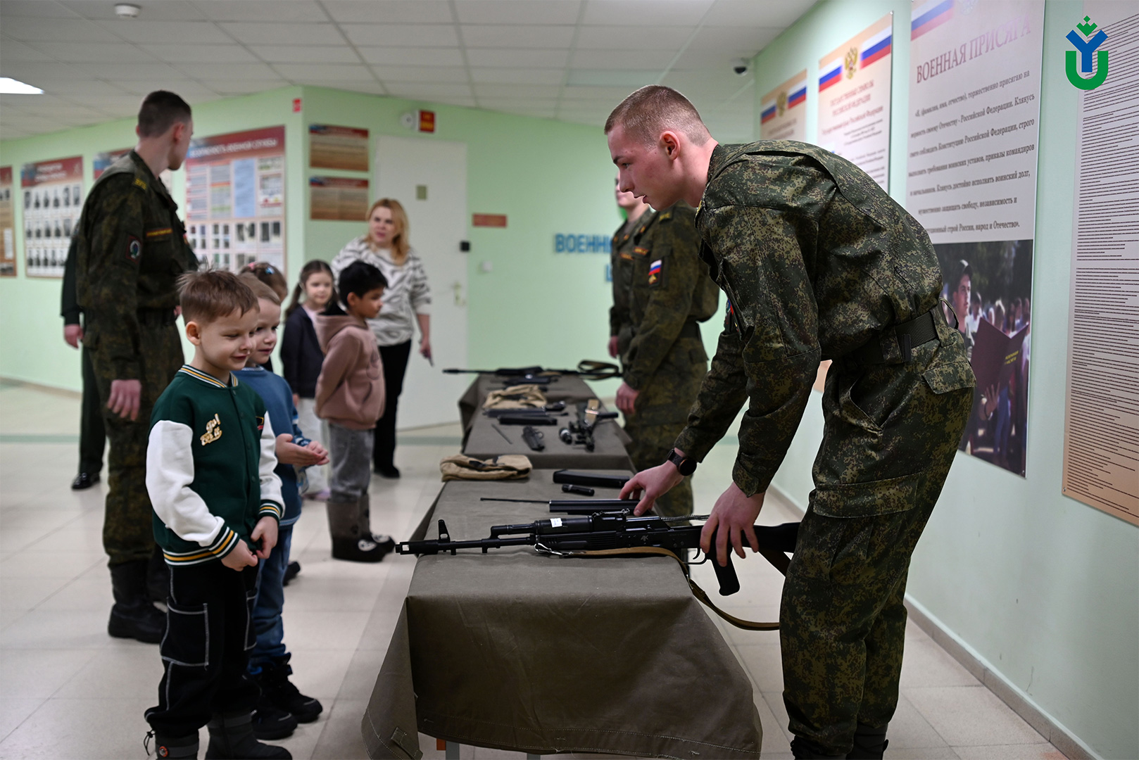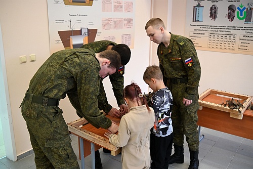 Курсанты ВУЦ показали ребятам сборку и разборку автомата Калашникова, где ребята смогли посмотреть из каких элементов состоит оружие, рассказали как они плетут маскировочные сети и нашлемники, обучая при этом ребят.