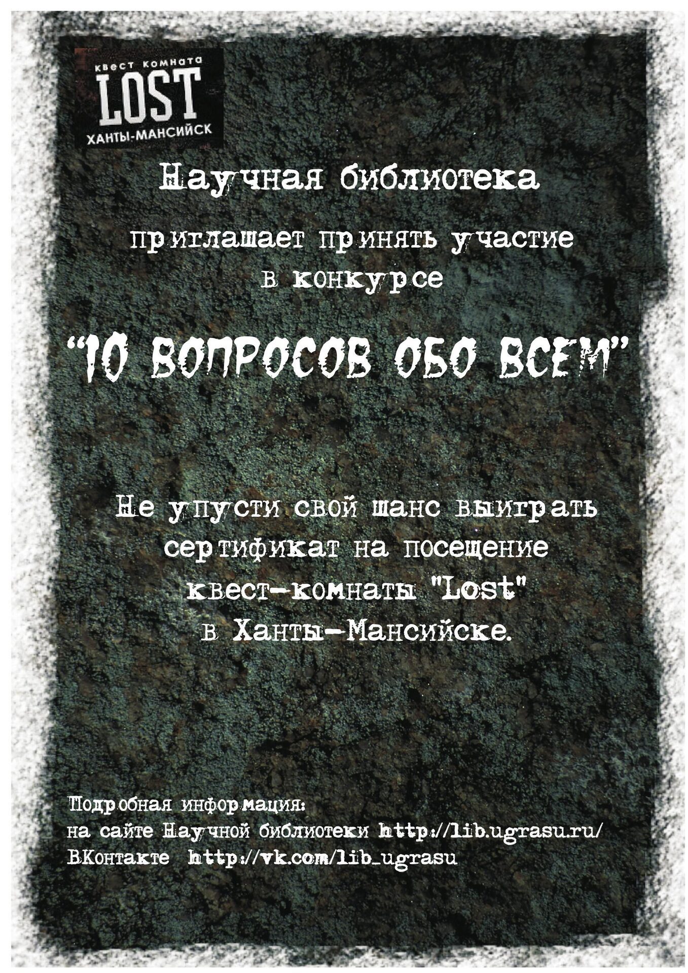 Каждый будний день, в 09.00, на стене в группе Научной библиотеки ЮГУ и в зале электронной информации (адм. корп. / 313) будет появляться вопрос, ответив на который вы получаете шанс выиграть сертификат на посещение квест-комнаты «Lost» в Ханты-Мансийске.