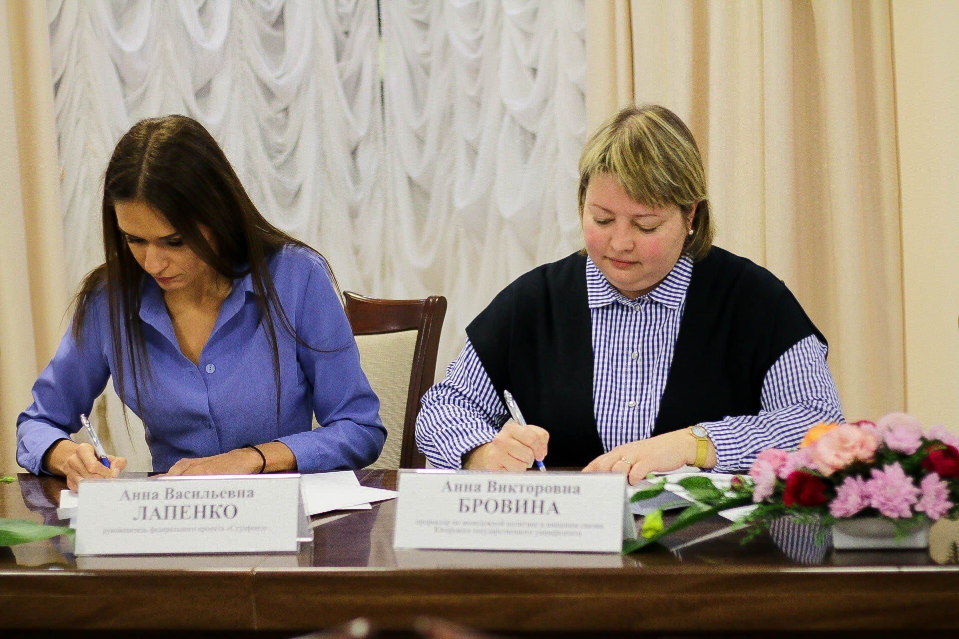 Соглашение о сотрудничестве между Фондом содействия в поиске работы, в прохождении стажировки и трудоустройстве студентов «Банк студенческих стажировок» скрепили подписями проректор вуза Анна Бровина и Генеральный директор Егор Литвиненко.
