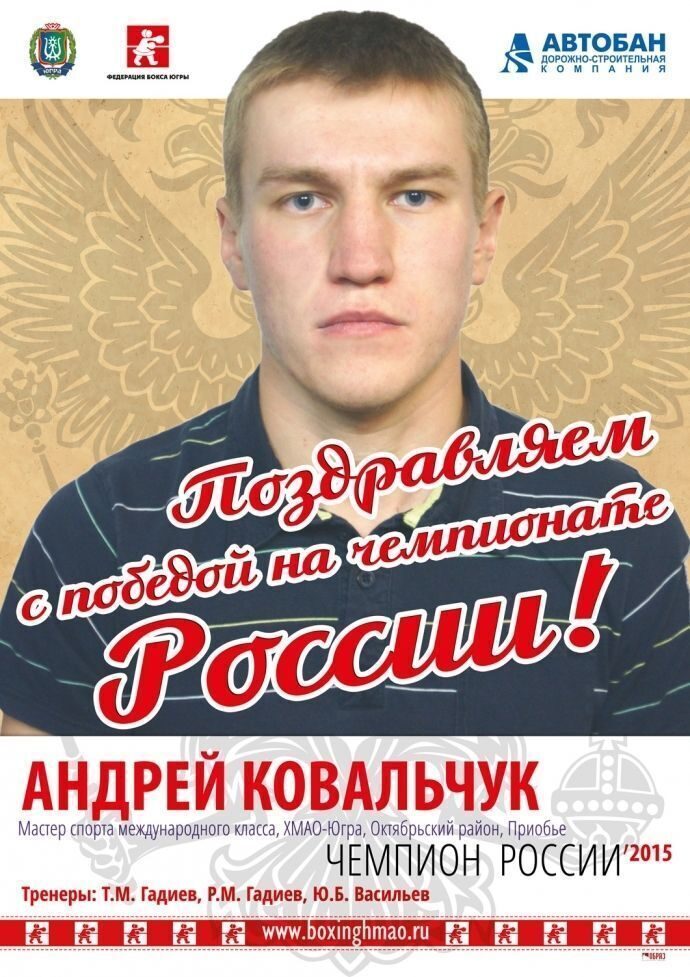 Двадцатитрехлетний югорчанин Андрей Ковальчук – чемпион России по боксу среди мужчин в 2015 году, чемпион Урала по боксу среди мужчин в 2013 и 2014 годах, победитель чемпионата округа, чемпионата УрФО, кубка мира среди нефтяных стран 2013-2014 годов, призер чемпионата России среди мужчин в Ростове-на-Дону.