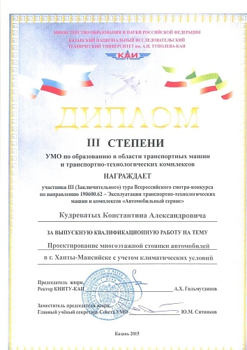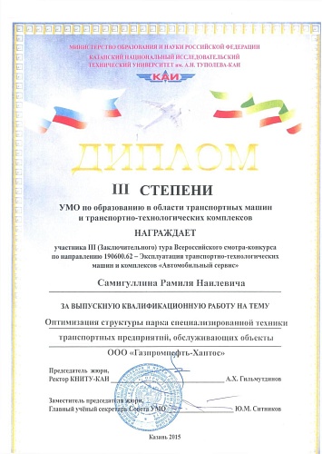 Учебно-методическое объединение высших учебных заведений России (УМО) по образованию в области транспортных машин и транспортно-технологических комплексов Минобрнауки провело Всероссийский смотр-конкурс выпускных квалификационных работ студентов очной и заочной форм обучения, выполненных в 2015 году. По решению УМО Всероссийский смотр-конкурс проводился на базе Казанского национально исследовательского технического университета им. А.Н.Туполева в рамках Всероссийской студенческой Олимпиады 2015 г.