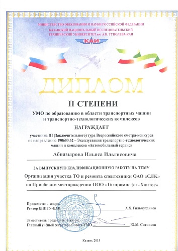 Выпускная квалификационная работа студента Ильяса Абназырова на тему «Организация уча-стка технического обслуживания и ремонта специальной техники ОАО «Сервисная Логистиче-ская Компания» на Приобском месторождении ООО «Газпромнефть-Хантос»» (научный руко-водитель к.т.н., доцент Назаров В.П.) заняла второе место в номинации «Проектирование городских СТО».