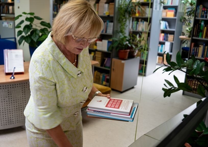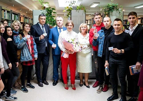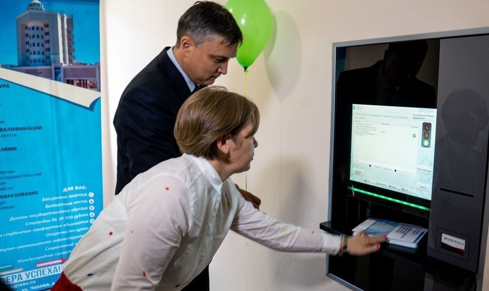 Ректор Югорского госуниверситета Татьяна Карминская стала обладателем читательского билета нового образца под номером 000001 и сразу же воспользовалась возможностью получить книги через станцию самостоятельного обслуживания.