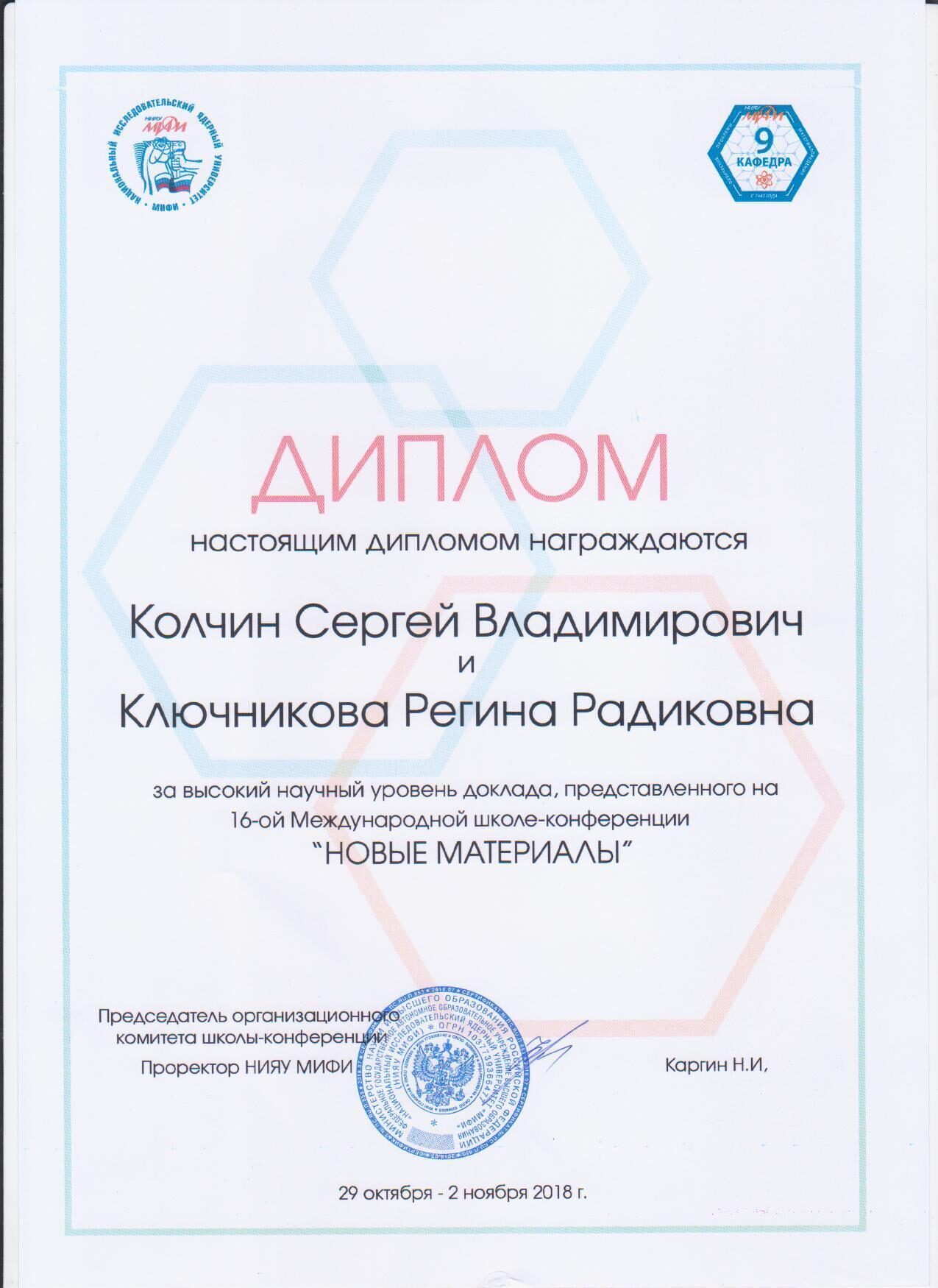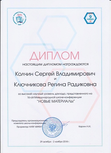 Студенты Югорского госуниверситета Сергей Колчин и Регина Ключникова представили на школе свои работы «Получение радиационно-стойкого материала методом СВС на основе системы Fe₂O₃-Al-Cr₂O₃3-MoO₃-Ti» и «Получение пористых фильтров методом СВС на основе системы Fe₂O₃-Al-Al₂O₃».