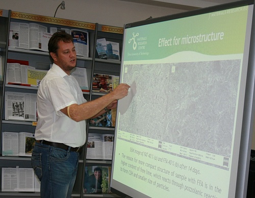 Центр материаловедения был создан при финансовой поддержке Евросоюза, и одна из главных его целей - сотрудничество с предприятиями промышленности. Г-н Шилер на своем примере продемонстрировал, как подобное сотрудничество реализуется. Он изучает возможности использования вторичных материалов для улучшения качества цемента. Зольная пыль, образующаяся при сжигании угля на электростанциях, может использоваться в качестве заполнителя для пористой структуры цементов, значительно увеличивая их прочность и другие механические свойства. С той же целью может использоваться кварцевая пыль и другие отходы производства.
