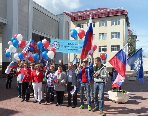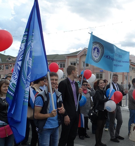 Колонну, украшенную флагами и воздушными шарами в цветах российского триколора возглавила ректор Татьяна Карминская, проректоры и директора институтов ЮГУ. Многие сотрудники университета пришли на праздник семьями и с детьми.