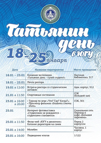 Всего в Югорском государственном университете обучается 25 Татьян: в Гуманитарном институте – 5, в Институте систем управления и информационных технологий – 2, в Институте природопользования – 7, в Политехническом институте – 2, и самое большее количество в Институте менеджмента и экономики – 9.