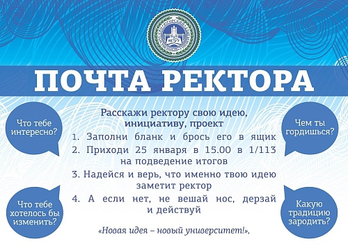 Если у тебя есть хорошая идея, которую ты хочешь воплотить в жизнь, но тебе чего-то не хватает для этого, то напиши о своём проекте в «Почту ректора», и возможно именно твоя идея будет воплощена в университетскую жизнь.