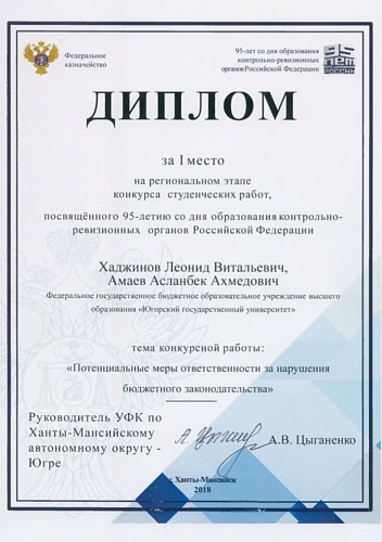 Награждение победителей конкурса прошло в торжественной обстановке на мероприятии, посвященном 95-летию со дня образования контрольно-ревизионных органов Российской Федерации. Заместитель руководителя Управления Е.Э. Кардава лично наградил победителей Конкурса – студентов Югорского государственного университета Леонида Хаджинова и Асланбека Амаева.