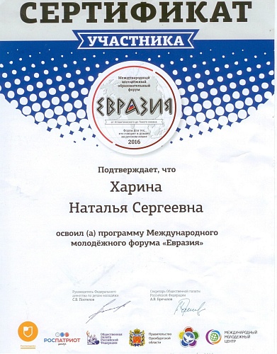 – Каждый день был насыщен образовательной программой,– рассказывает Наталья Харина. – Форум «Евразия» для мирового сообщества важен тем, что это прекрасная возможность для собственного развития среди молодежи. Неплохая возможность поделиться своим опытом и позаимствовать его у других. Благодаря Форуму должна будет появиться площадка, которая обеспечит условия для продуктивного диалога молодёжных организаций России и иностранных государств, объединённых любовью к России, её культуре и языку. Меня, прежде всего, интересовали вопросы патриотического воспитания, и я получила на них ответы.