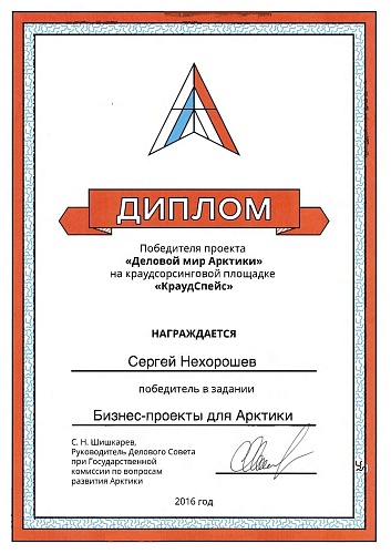 Диплом Победителя проекта «Деловой мир Арктики» на краудсорсинговой площадке «КраудСпейс» в задании «Бизнес-проекты для Арктики» получил д.х.н., заведующий Комплексной научно-образовательной лабораторией ЦКП НО Сергей Нехорошев за проект «Превратим отходы полиолефинов в искусственную нефть».