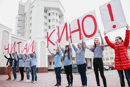 Теплый апрельский вечер. Двор Югорского государственного университета. Играет всеми любимая музыка из кинофильма «Джентльмены удачи». Девушки в тельняшках синхронно выполняют танцевальные движения, а по окончании танца выстраиваются в колонну с буквами, из которых складывается фраза «Читай кино!». Читай кино – это тема Всероссийской библионочи, которая прошла во всех библиотеках страны 22 апреля.