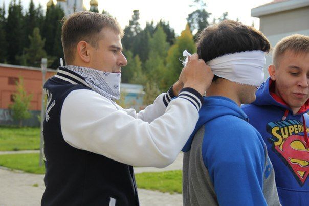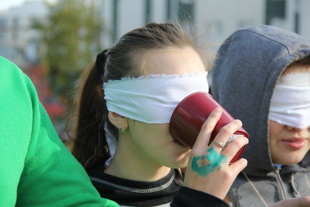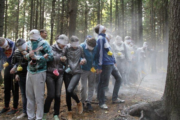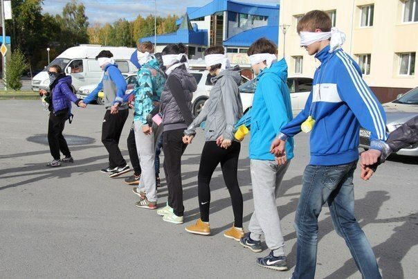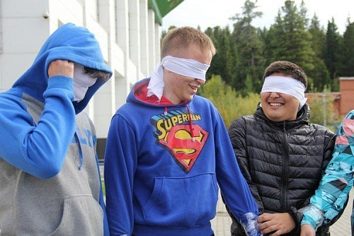 Ребята с завязанными глазами преодолевали разного рода испытания, работали в команде, проверялись на ловкость и умение ориентироваться в любой ситуации, пели песни.