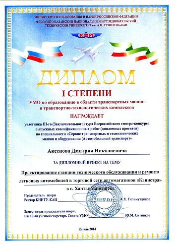 Диплом I степени – Выпускная квалификационная работа студента группы З-5380 Дмитрия Аксёнова на тему «Проектирование станции технического обслуживания и ремонта легковых автомобилей в торговой сети автомагазинов «Канистра» в г. Ханты-Мансийск» (научный руководитель к.т.н., доцент Горгоц К. Г.) заняла первое место в номинации «Проектирование городских СТО».