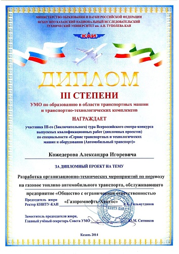 Диплом III степени – Александра Кожедерова на тему «Разработка организационно-технических мероприятий по переводу на газовое топливо автомобильного транспорта, обслуживающего предприятие Общество с ограниченной ответственностью «Газпромнефть-Хантос» г. Ханты-Мансийск» (научный руководитель д.с.х.н., профессор Чумак Владимир Александрович);