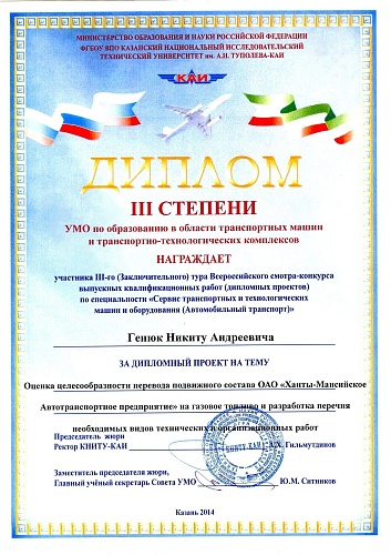 Никиты Генюка на тему «Оценка целесообразности перевода подвижного состава Открытого акционерного общества «Ханты-Мансийское автотранспортное предприятие» на газовое топливо и разработка перечня необходимых видов технических и организационных работ» (научный руководитель к.т.н., доцент Горгоц К.Г.);