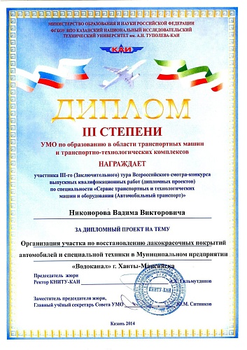 Диплом III степени – Вадима Никонорова на тему «Организация участка по восстановлению лакокрасочных покрытий автомобилей и специальной техники в Муниципальном предприятии «Водоканал» г. Ханты-Мансийска» (Научный руководитель ст. преподаватель Парфенов Юрий Витальевич).