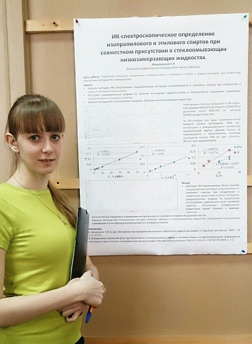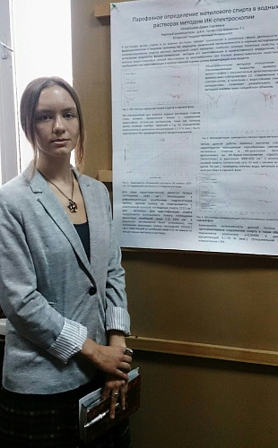Дарья выступила на подсекции «Аналитическая химия» с докладом «Парофазное определение метилового спирта в водных растворах методом ИК-спектроскопии».