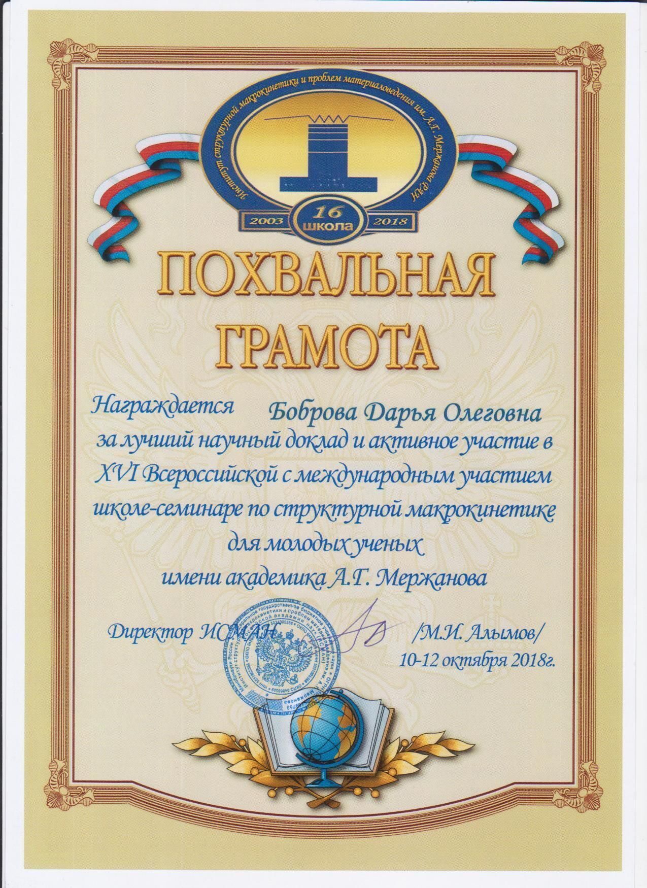 Студенты-материаловеды Сергей Чеклов и Дарья Боброва получили Похвальные грамоты за «Лучший научный доклад» на XVI Всероссийской с международным участием Школе-семинаре по структурной макрокинетике для молодых ученых имени академика А.Г. Мержанова. Школа-семинар состоялась в Федеральном государственном бюджетном учреждении науки «Институт структурной макрокинетики и проблем материаловедения Российской академии наук» с 9 по 13 октября.