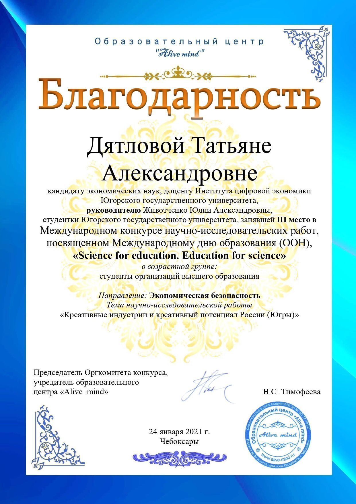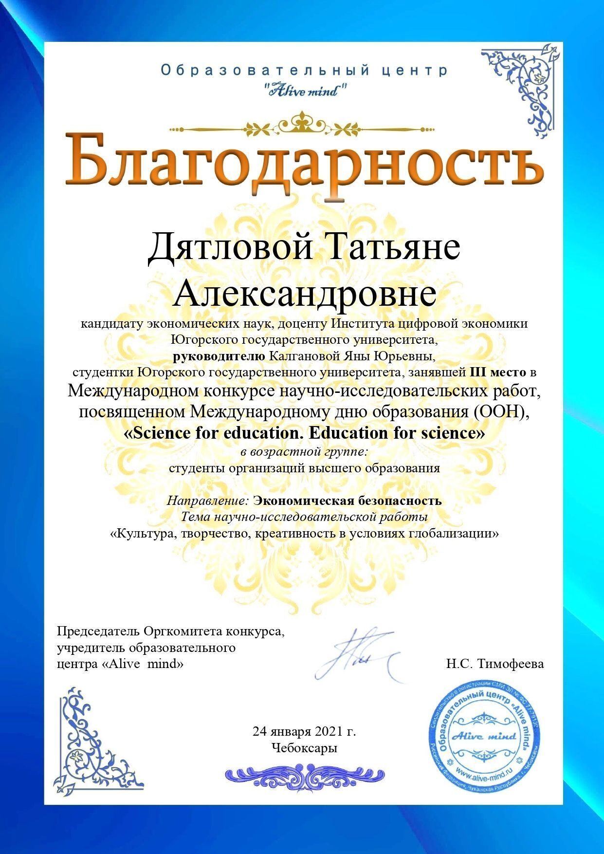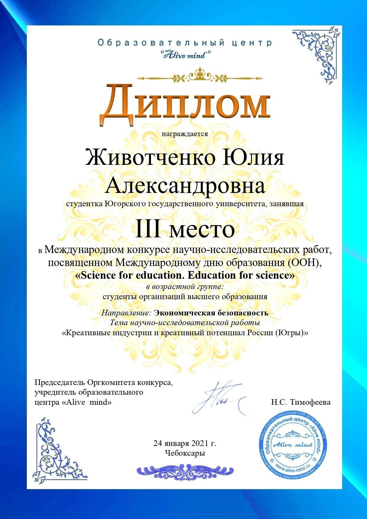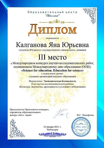 С 18 по 24 января 2021 года в г. Чебоксары состоялся международный конкурс научно-исследовательских работ, посвященный Международному дню образования (ООН) «Science for education. Education for science» («Наука для образования. Образование для науки»).