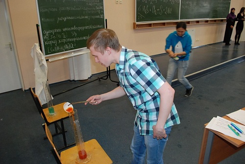 Посвящение в химики проходит весело: конкурсы, загадки и сценки перемешиваются с ответами на вопросы по учебным дисциплинам и практическими заданиями – всё та же знакомая и любимая лабораторная обстановка. В этом году студенты и преподаватели соревновались в перетягивании каната, ребята уравнивали окислительно-восстановительную реакцию, дописывали продукты реакции и исходные вещества. Перемещали вещества в фарфоровых чашках, держа их тигельными щипцами и угадывали название химической посуды с завязанными глазами.