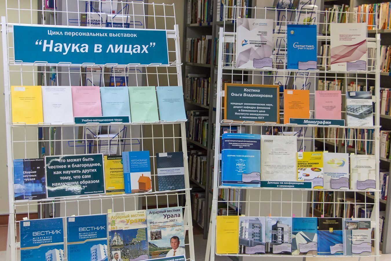 17 ноября состоялась открытие персональной выставки трудов Костиной Ольги Владимировны, кандидата экономических наук, доцента кафедры финансов и банковского дела Института менеджмента и экономики ЮГУ.