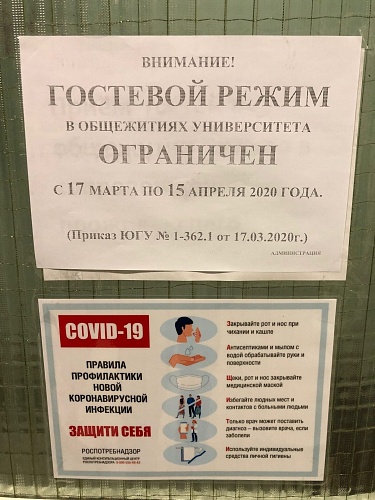 В общежитиях предпринят ряд мер по профилактике распространения COVID-19 (коронавируса): закуплены средства термометрии, на входах в общежития установлены антисептики, в каждой комнате размещены информационные материалы с описанием симптомов заболевания и мерами предосторожности. Студенческий отряд по контролю за соблюдением правил проживания в общежитиях ежедневно осуществляет обход, контролируя выполнение рекомендаций по предупреждению распространения COVID-19. Ребята cледят за выполнением санитарных норм в комнатах и обработкой помещений общего пользования с применением дезинфицирующих средств.