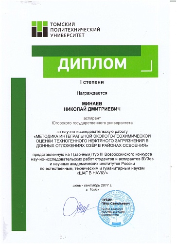 Николай Минаев выступал в Кластере «Ресурсы планеты» по направлению «Геоэкология и рациональное природопользование». За НИР по теме «Методика интегральной эколого-геохимической оценки техногенного нефтяного загрязнения донных отложений озер в районах освоения» Николай награжден Дипломом I степени на заочном туре конкурса. Научный руководитель: д.т.н., доцент, главный научный сотрудник Ханты-Мансийской государственной медицинской академии А.В. Нехорошева.