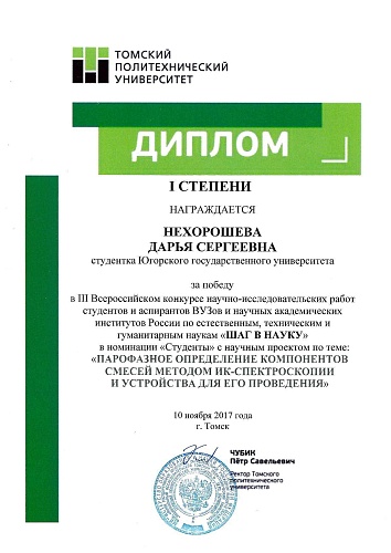 .Тема научного доклада студентки ЮГУ «Парофазное определение компонентов смесей методом ИК-спектроскопии и устройства для его проведения». Научный руководитель: д.х.н., профессор Югорского государственного университета Л.С.Клименко.