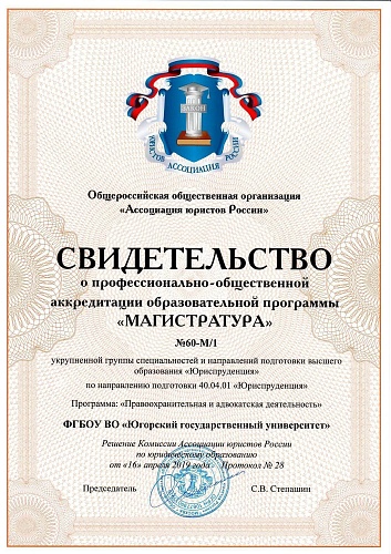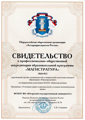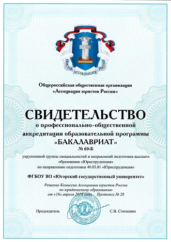 Общероссийская общественная организация «Ассоциация юристов России» выдала Югорскому госуниверситету свидетельства о профессионально-общественной аккредитации образовательных программ: