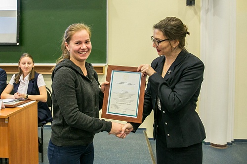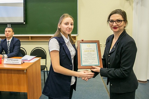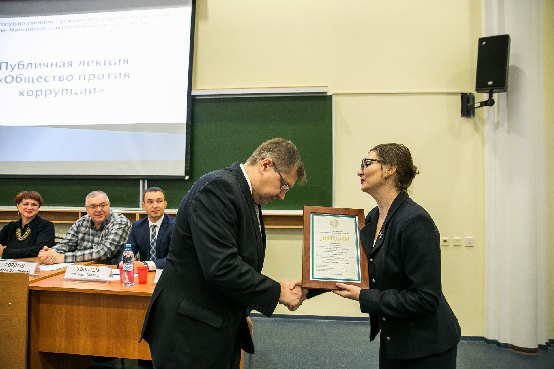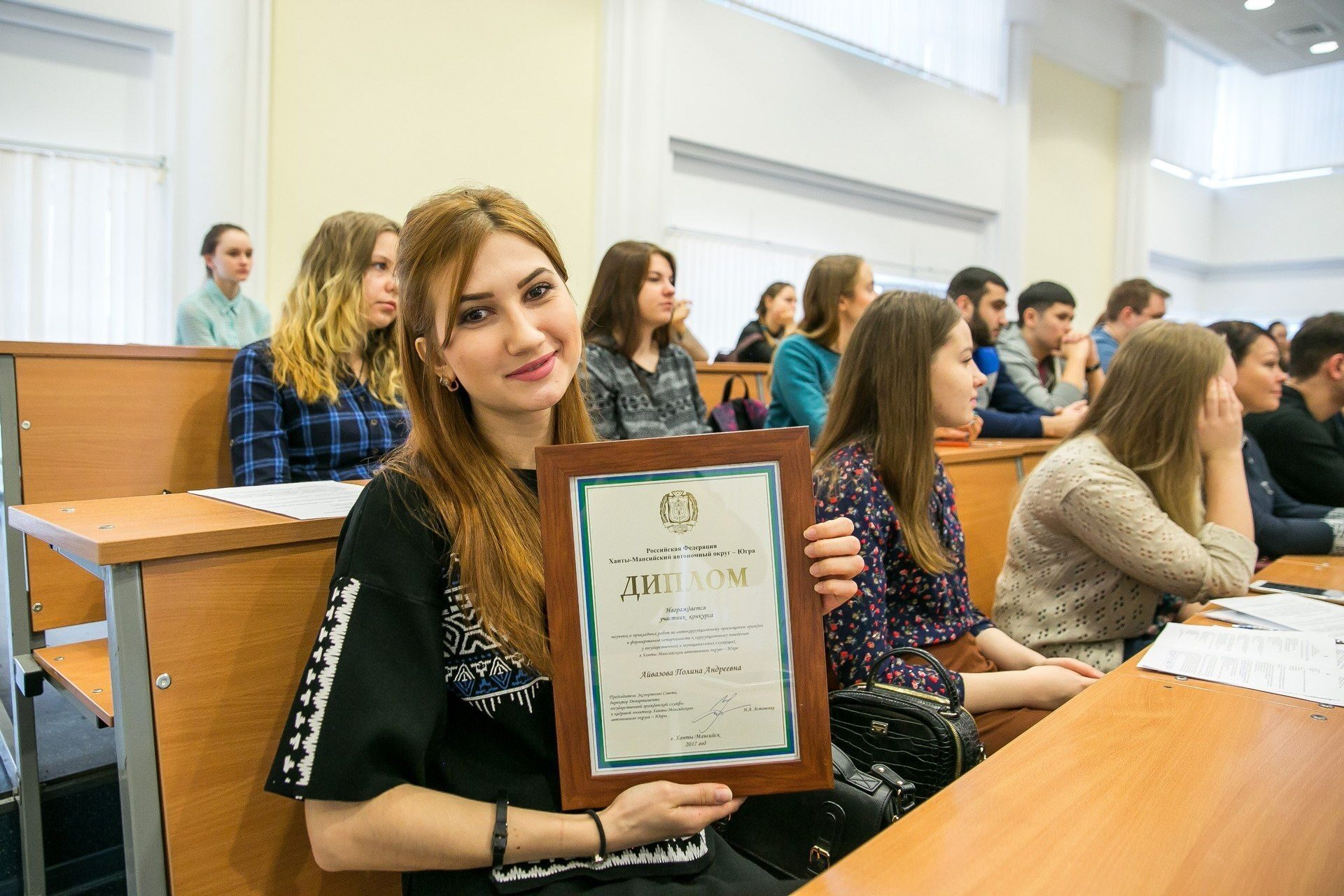 В рамках мероприятия прошло награждение победителей и участников конкурса научных и прикладных работ по антикоррупционному просвещению граждан и формированию нетерпимости к коррупционному поведению у государственных и муниципальных служащих в Ханты-Мансийском автономном округе – Югре. Студентки нашего университета: Наталья Кармацких, Диана Попова, Вера Зольникова и Полина Айвазова получили Дипломы из рук директора Департамента государственной гражданской службы и кадровой политики автономного округа Ирины Астапенко.