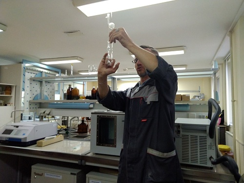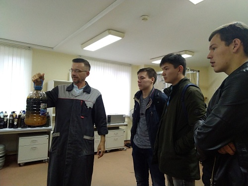 В лаборатории химии нефти и газа студенты не вмешивались в работу Олега Кузьменко, а лишь наблюдали за мастер-классом профессионала. Мастер показал студентам пробы нефти, продемонстрировал работу приборов лаборатории и рассказал интересные факты о добыче нефти.