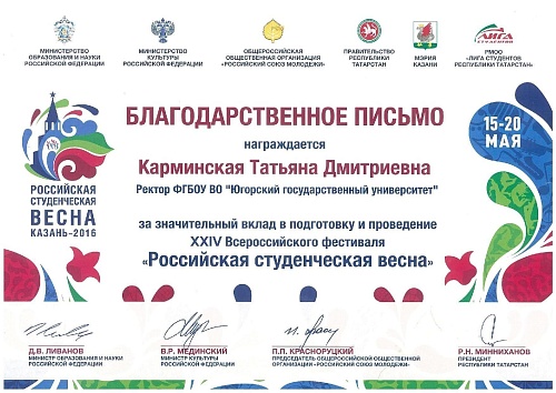 Cтуденты Югорского государственного университета в составе делегации Ханты-Мансийского автономного округа приняли участие во всероссийском этапе конкурса «Студенческая весна 2016», по итогам которого команда заняла первое место в общем зачете и взяла гран-при за региональную программу.