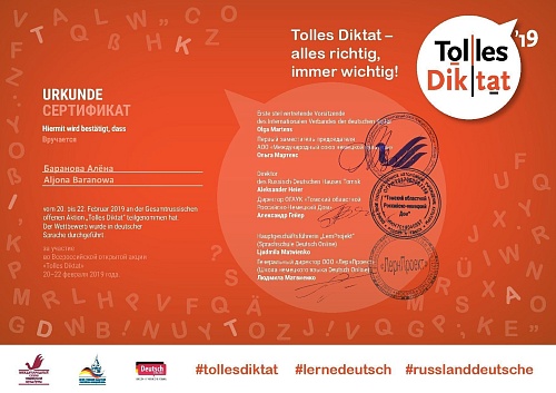 21 февраля в Югорском госуниверситете состоялась Всероссийская открытая акция «Tolles Diktat – 2019» (Открытый диктант по немецкому языку), в которой приняли участие более 100 студентов Югорского университета и жителей Ханты-Мансийска, изучающих немецкий язык. Результаты акции были объявлены в начале апреля. Участники открытого диктанта – 2019 по немецкому языку получили дипломы победителей и призеров.