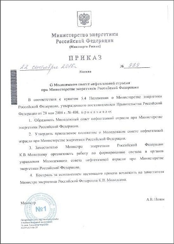 22 сентября Министр энергетики Российской Федерации Александр Новак подписал приказ о создании Молодежного совета нефтегазовой отрасли при Министерстве энергетики Российской Федерации.