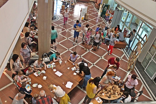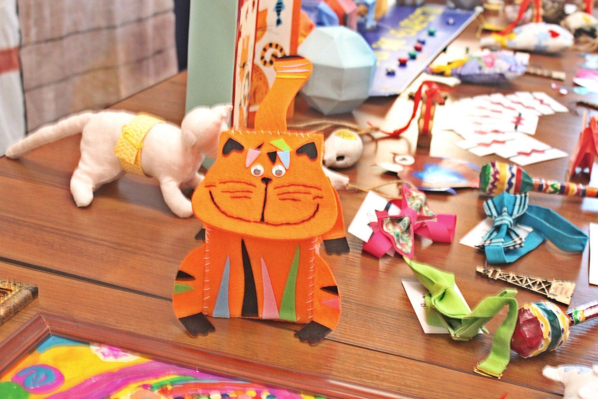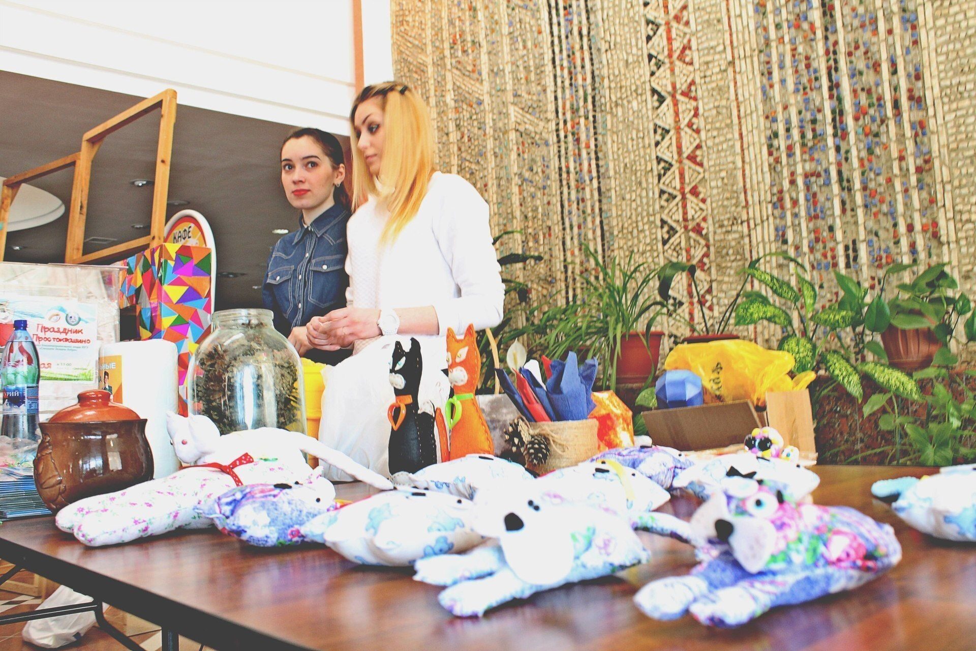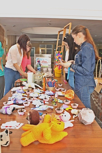 Ярмарка поделок удалась на славу! Свистульки из глины, открытки и сувениры, галстуки-бабочки, магниты, свечи и рисунки, но больше всего здесь было котиков. Всевозможные разноцветные кошки и коты из разных материалов – бумажные, фетровые, ситцевые, глиняные, стеклянные, мозаичные, полимерные и картонные создали живописный ковер. Все это великолепие изготовили ученики 2 «Е» класса школы № 3, дети сотрудников, студенты и сотрудники университета, воспитанники «Лучика», рукодельницы из «В бабочках» и мастерицы студии творчества «Teddy & Beads».