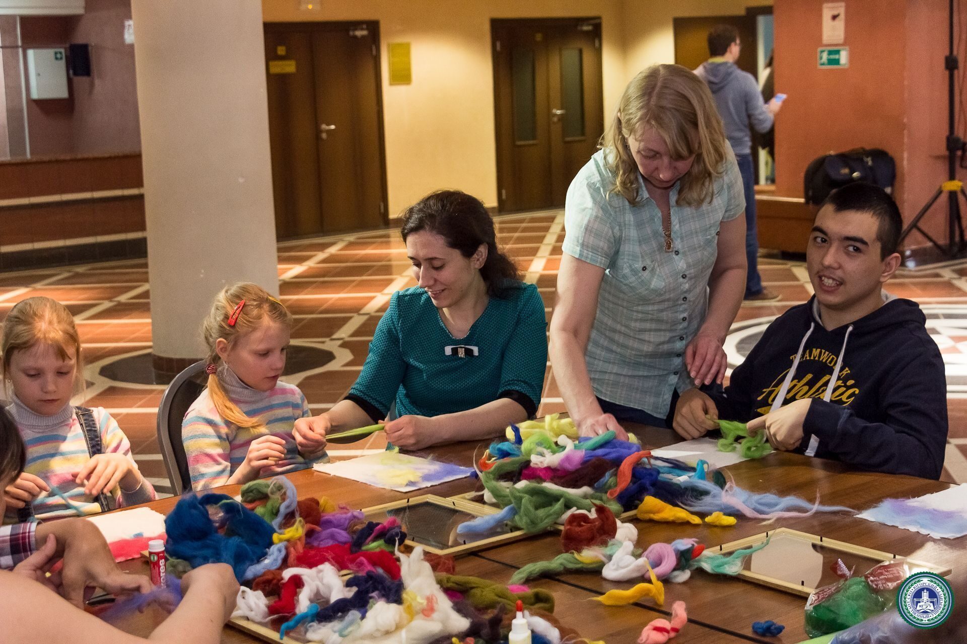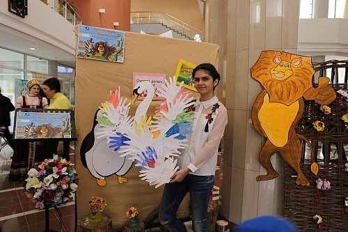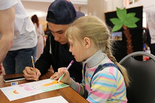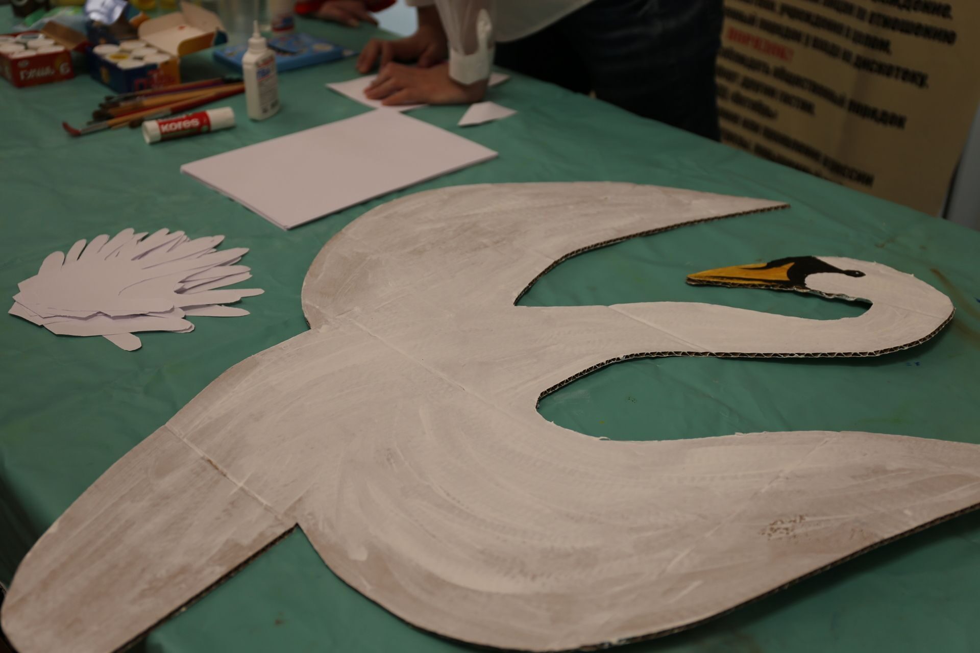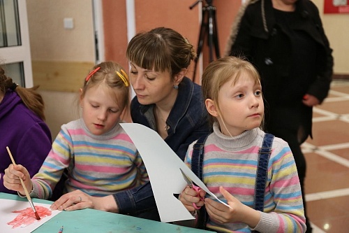 Студенты и дети вместе работали над оперением картонного лебедя. Рука каждого участника праздника «превращалась» в нежные лебединые перышки. Здесь же любители рисования «писали» гуашью и фломастерами истории из своей жизни: кто-то нарисовал свою семью, кто-то вспомнил отдых на море и огромный корабль, а маленькая Инесса посвятила работу сестре-двойняшке Агнессе.