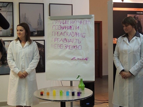 Изюминкой открытия выставки стала химическая магия. Преподаватели и студенты-химики Института природопользования «разлили радугу» и проявили скрытую на планшете надпись «Границ научному познанию и предсказанию предвидеть невозможно. Менделеев».